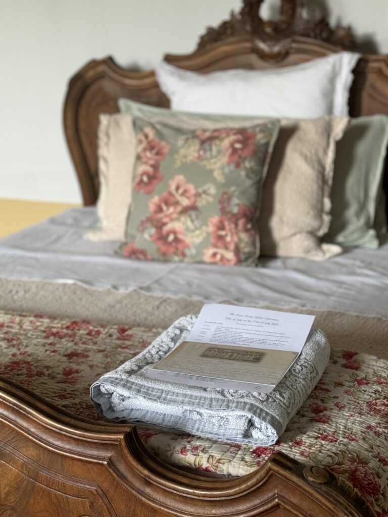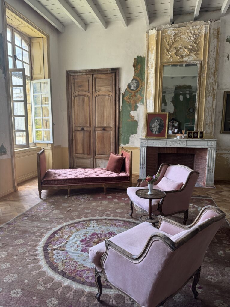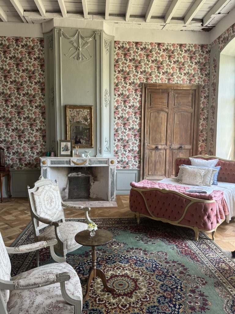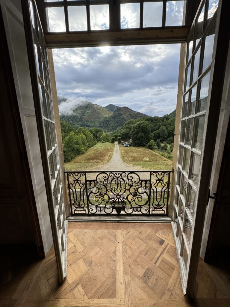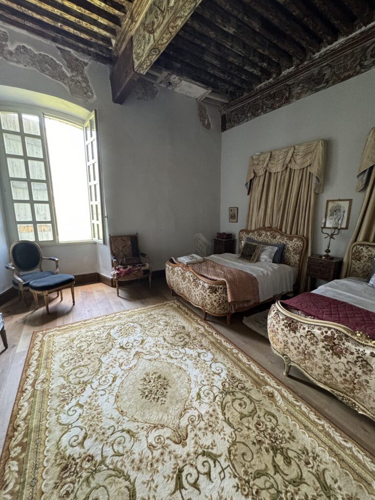 During our tour, Karina revealed each guest’s room one by one during our introductory tour of the chateau. Kim and I were given the front room known as the Marie Antoinette Room, with tall ceilings, antique furniture, open shuttered windows, and remnants of 1800s wallpaper. And yes,  no A/C. 😅 But thankfully, I packed travel fans from Amazon that saved the day, and the large windows proved perfect for letting me have the cool breeze from the Pyrenees Mountains.