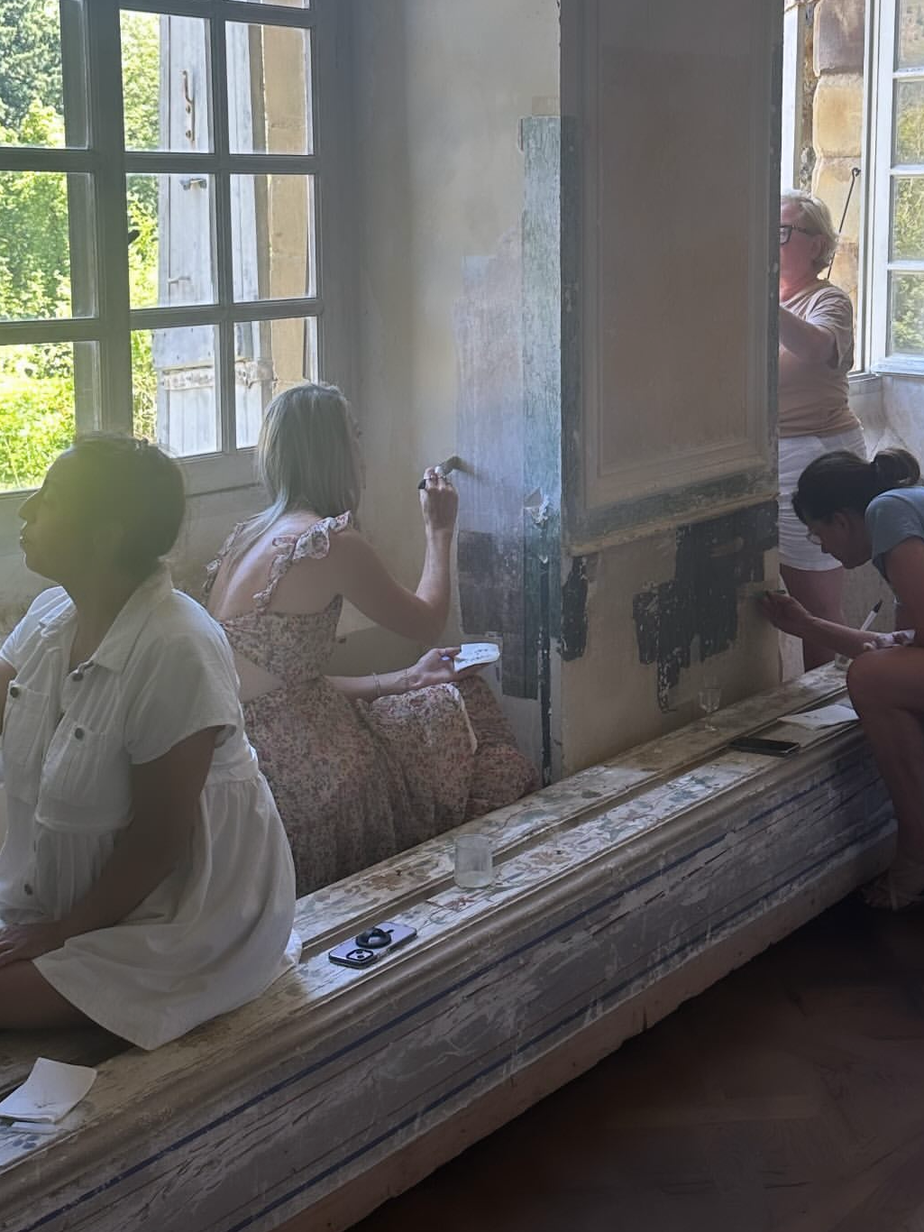 • Restoration class with Jasmine in Salon de Printemps: uncovering frescoes hidden beneath Revolutionary-era plaster.