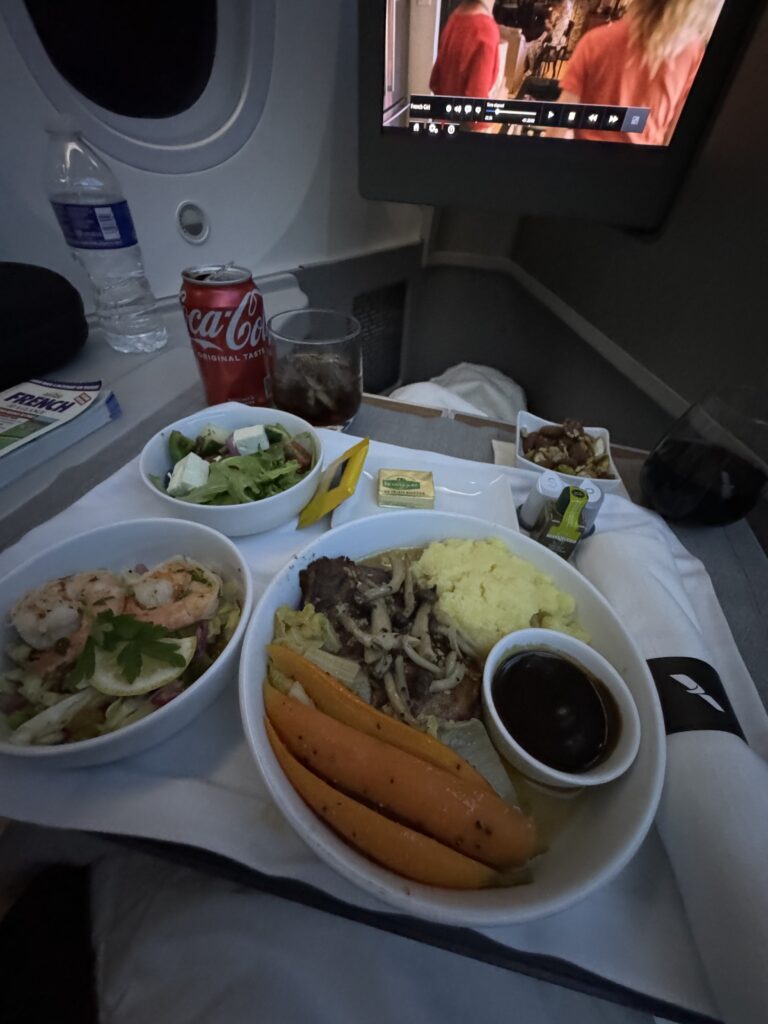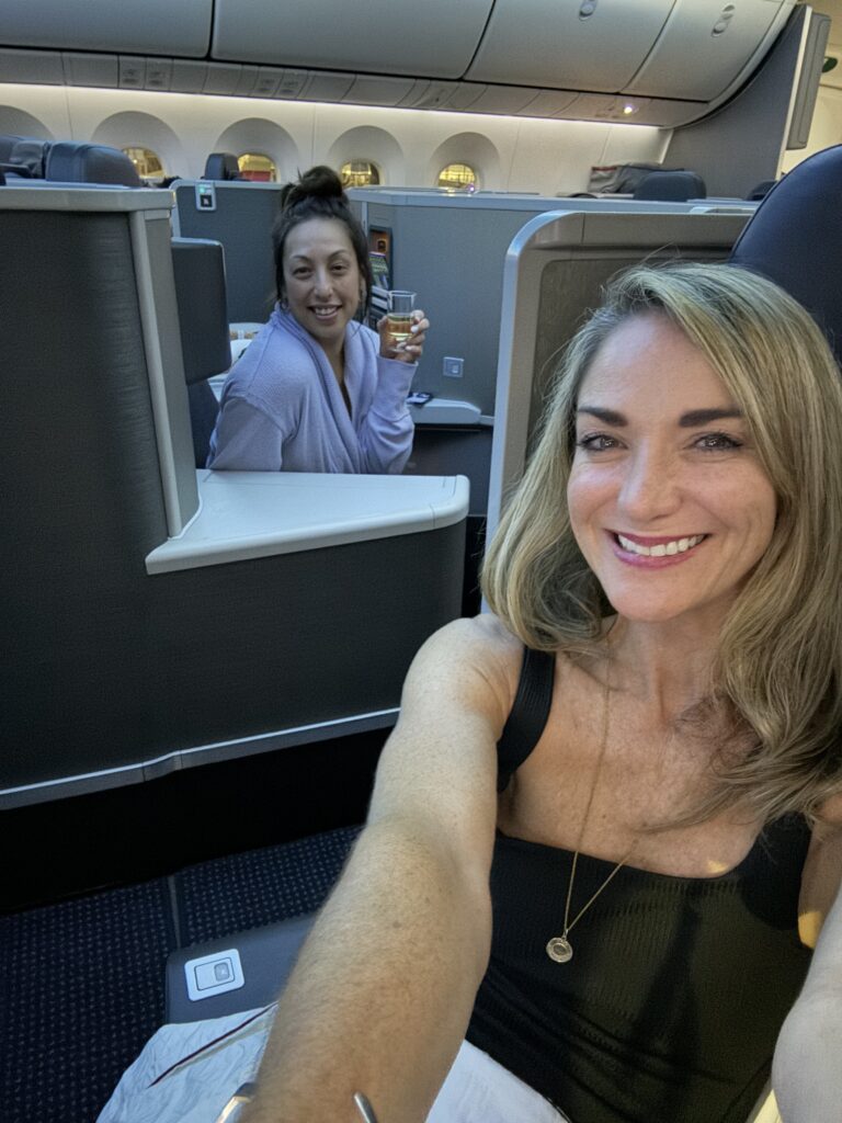 We booked lay-flat seats on American Airlines—her first time flying first class, and a decision that proved fortuitous when I broke my tailbone just six days before departure. The comfort of those seats made the long flight manageable. There’s something about boarding early, reclining without guilt, and sipping wine before takeoff that makes the whole journey feel just as magical as the destination. So we did. We sipped champagne together, ate seabass, had cookies, slept, and watched movies, and were in absolute awe of how lucky and fortunate we were to be on such a spectacular journey…together.