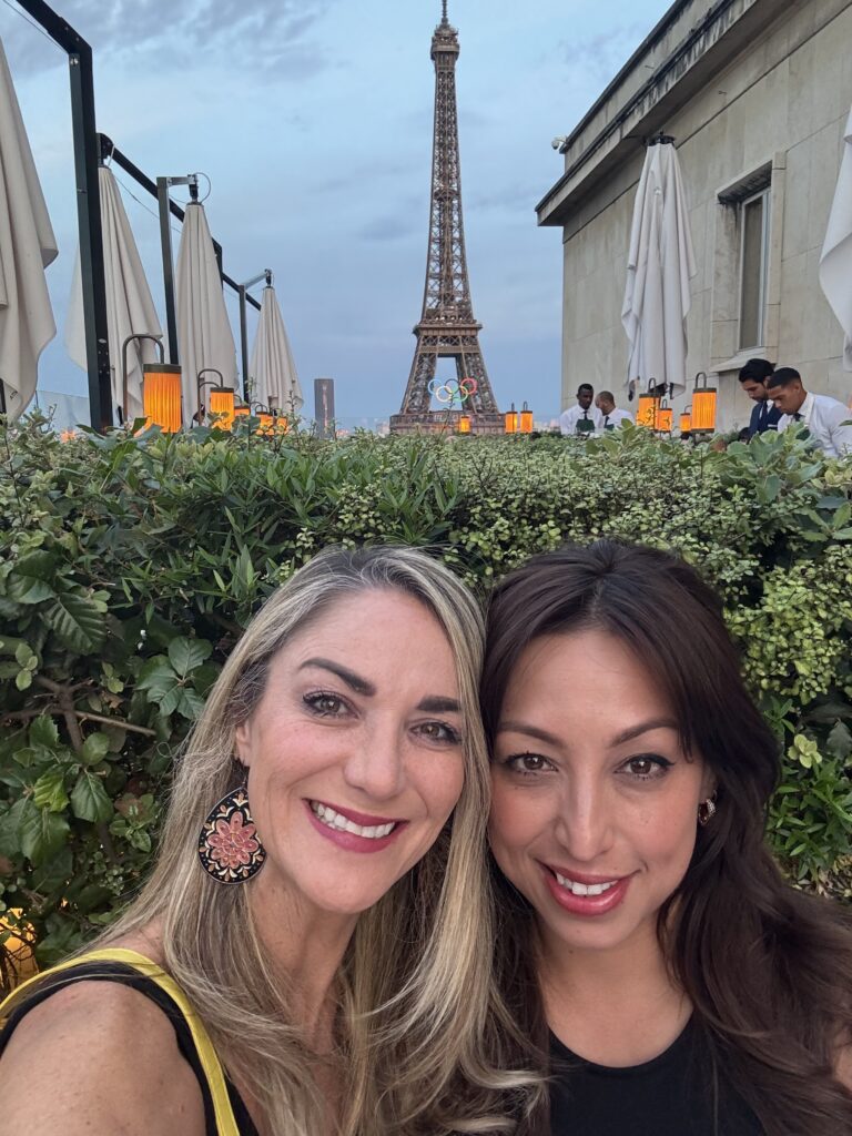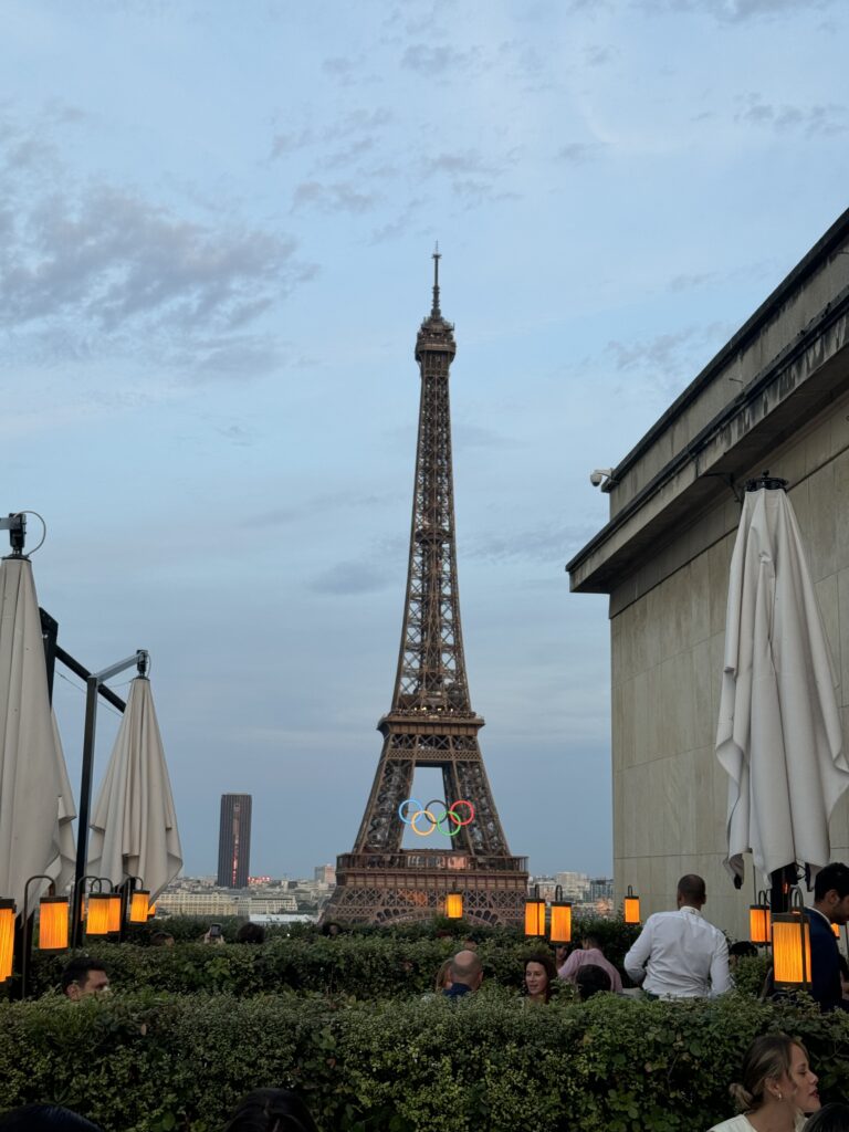 Later that evening, we capped off our day with an unforgettable dinner at La Suite, just on the rooftop of Girafe Paris, a rooftop gem we had discovered thanks to a last-minute TikTok deep dive (sometimes the algorithm really does know best 😉). We managed to snag a 10 PM reservation — a time our jet lag and packed itinerary didn’t mind one bit — and were promptly whisked up to a dreamy rooftop setting that offered a front-row seat to the Eiffel Tower, which happened to be dressed in its Olympic glory. Yes, the iconic tower was already adorned with the Olympic rings, just days ahead of the summer games kicking off in Paris.